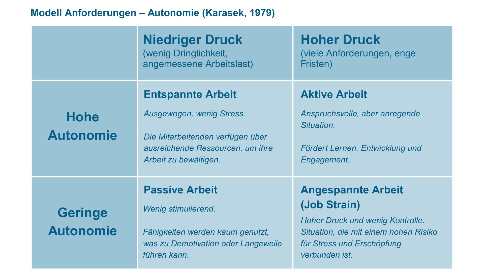 Das erste betrifft die Beziehung zwischen Anforderungen und Handlungsspielraum der Mitarbeitenden. Wenn der Druck hoch ist, die Autonomie gering und die Unterstützung unzureichend, steigt das Stressrisiko deutlich. Dies wird durch das Anforderungs‑Kontroll‑Modell von Robert Karasek (1979) belegt. Gemäss diesem Modell ist nicht nur die Menge der Arbeit problematisch, sondern auch der mangelnde Einfluss darauf, wie die Arbeit organisiert und ausgeführt wird.