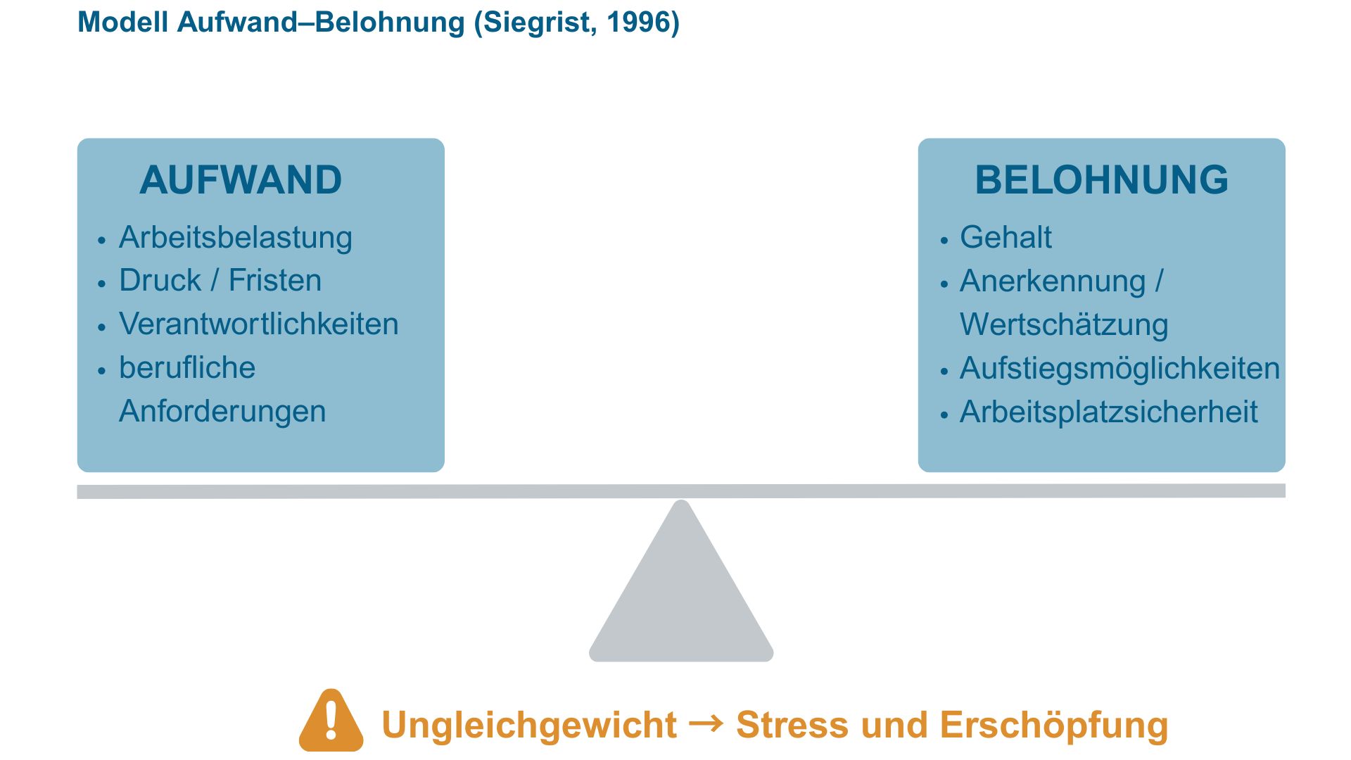 Das zweite Ungleichgewicht betrifft die Beziehung zwischen den erbrachten Leistungen und der erhaltenen Anerkennung. Gemäss dem Effort‑Reward‑Modell von Johannes Siegrist (1996) entsteht ein Gefühl der Ungerechtigkeit, wenn der Einsatz bei der Arbeit nicht ausreichend anerkannt wird — sei es durch Lohn, Wertschätzung oder Entwicklungsperspektiven.