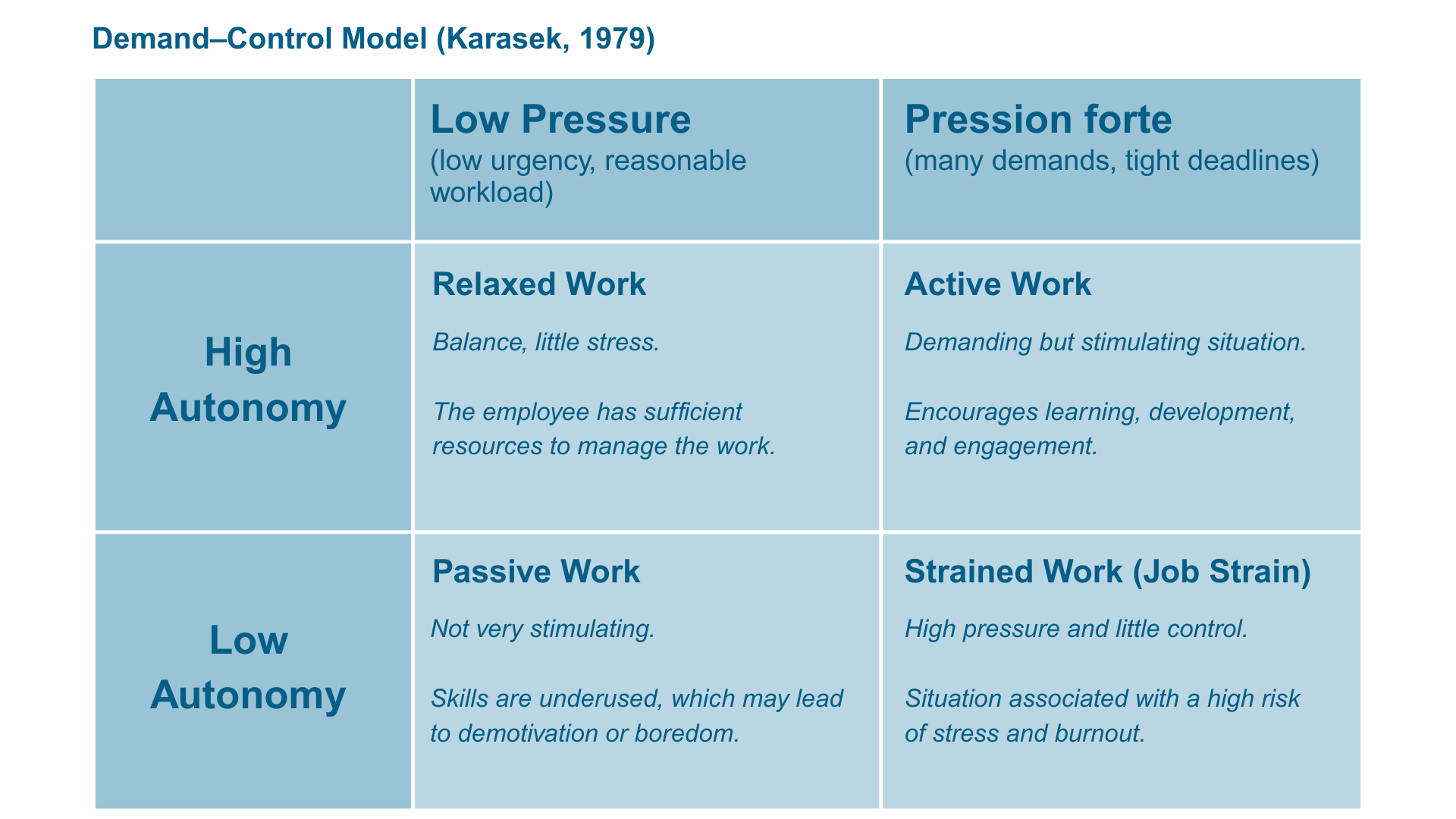The first relates to the relationship between job demands and the degree of control employees have over their work. When pressure is high, autonomy is low, and support is insufficient, the risk of stress increases significantly. This is illustrated by the demands–control model developed by Robert Karasek (1979). According to this model, it is not only the amount of work that creates strain, but also the lack of control over how that work is organized and carried out.
